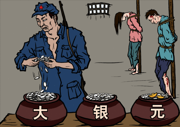 中共的一切都是抢来的。拉起红军搞武装割据,军火弹药、吃饭穿衣需要钱,而“筹款”的形式是打土豪抢银洋,与土匪没有区别。李先念的红军在鄂西一带绑票县城里的首富人家,不是绑一个,而是家族中每富裕家庭绑一个,叫“绑活票”。“绑活票”不“撕票”,即不杀人质,留下活口,目的是要家里人一坛一坛不断地送大银元去供养红军。直到喂饱了红军,或是家破人亡,无油水可榨,才把奄奄一息的人质放回。有人因此被惊吓折磨致死。