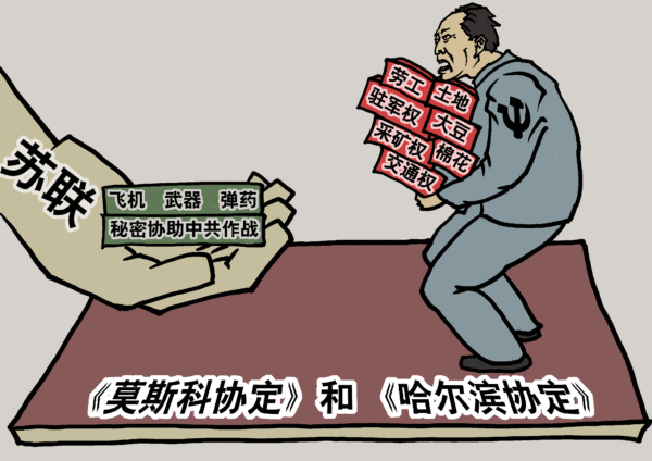 1947年至1948年,中共先后与苏联签订《哈尔滨协定》和《莫斯科协定》,出卖祖国权益和东北资源,换取苏联在外交和军事上全面支持中共。双方协定苏共经常供应50架飞机补充中共,将收缴的日本武器分两期全部给予中共,苏方控制的东北的弹药、军用物资平价售给中共。国民党一旦对东北发动两栖登陆攻势,苏共秘密协助中共军队作战。苏联协助中共夺取新疆控制权;建立苏中联合空军力量;装备中共11个师。把美国援助苏联的130亿美元的武器的三分之一运入东北。中共为了获取苏联支持,承诺苏联对东北陆路、空中交通的特权;对苏提供国民党政府和美军行动情报;以东北物产、棉花、大豆、战略物资供应苏联,换取精良武器;苏联有优先开采中国矿产的权利;有权在东北和新疆驻军;苏联可将远东情报局设在中国。如果欧洲爆发战争,中共应派远征军10万,劳工2百万支援苏联。除此之外,中共还承诺将辽宁、安东省的特别区域在适当时并入朝鲜。