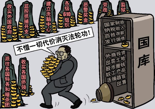 虽然目前还不清楚中共究竟动用了多少国家经济资源和人民的血汗收入来迫害法轮功,但是推算一下就不难看出会是天文数字。2001年,来自中共公安内部的消息显示:仅天安门一地,抓捕法轮功学员一天的开销就达170万到250万人民币,即一年的支出达6亿2千万到9亿1千万。全国范围内,从城市到边远的农村,从派出所警察,到公安局,再到各级“610办公室”人员,江泽民为迫害法轮功估计至少雇佣了数百万人,这笔工资花费可达每年上千亿元人民币。不仅如此,江泽民花费巨额经费扩建关押法轮功学员的劳教所和建立洗脑中心和基地等。例如,2001年12月,江泽民一次性投入42亿元人民币建立转化法轮功学员的洗脑中心或基地。江泽民还用金钱刺激和鼓励更大批的人参与迫害法轮功,很多地区,每抓到法轮功学员奖励数千乃至上万元。而在对法轮功的迫害邪恶至极的辽宁马三家劳教所,中共一次性奖励所长苏某5万元人民币,副所长邵某3万元人民币。